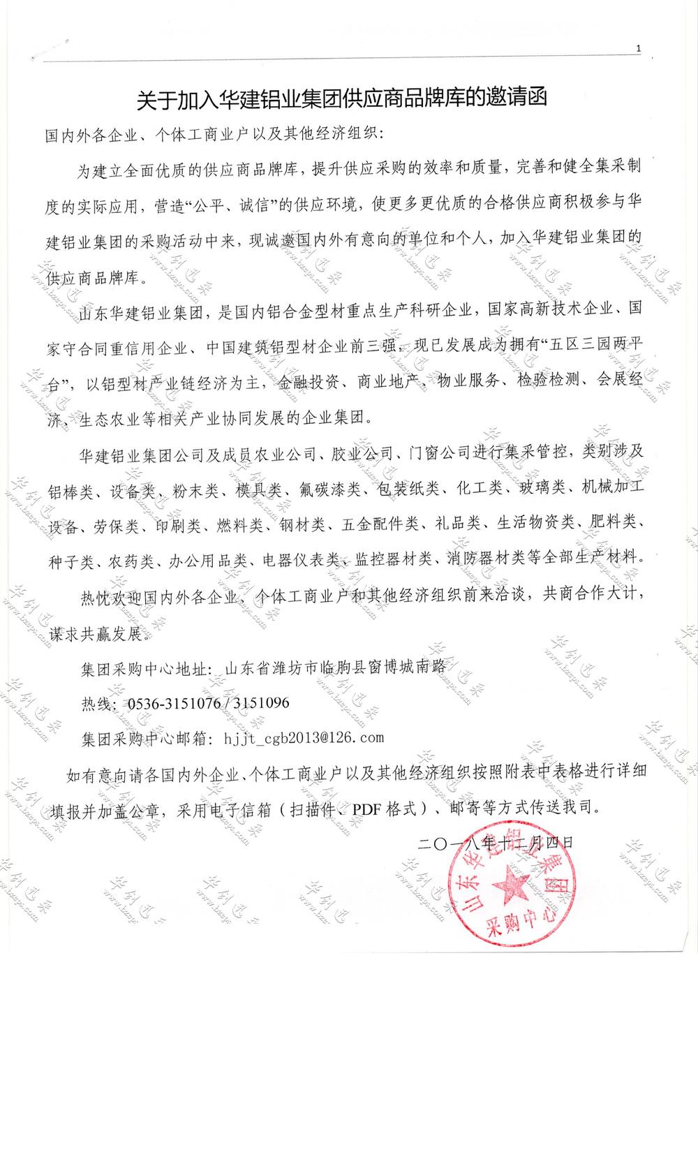 国内外各企业、个体工商业户以及其他经济组织:为建立全面优质的供应商品牌库,提升供应采购的效率和质量,完善和健全集采制度的实际应用,营造“公平、诚信”的供应环境,使更多更优质的合格供应商积极参与华建铝业集团的采购活动中来,现诚邀国内外有意向的单位和个人,加入华建铝业集团的供应商品牌库。山东华建铝业集团,是国内铝合金型材重点生产科研企业,国家高新技术企业、国家守合同重信用企业、中国建筑铝型材企业前三强,现已发展成为拥有“五区三园两平台”,以铝型材产业链经济为主,金融投资、商业地产、物业服务、检验检测、会展经济、生态农业等相关产业协同发展的企业集团。华建铝业集团公司及成员农业公司、胶业公司、门窗公司进行集采管控,类别涉及铝棒类、设备类、粉末类、模具类、氟碳漆类、包装纸类、化工类、玻璃类、机械加工设备、劳保类、印刷类、燃料类、钢材类、五金配件类、礼品类、生活物资类、肥料类、种子类、农药类、办公用品类、电器仪表类、监控器材类、消防器材类等全部生产材料。热忱欢迎国内外各企业、个体工商业户和其他经济组织前来洽谈,共商合作大计,谋求共赢发展。集团采购中心地址:山东省潍坊市临朐县窗博城南路热线:0536-3151076 / 3151096集团采购中心邮箱:hjjt_cgb2013@126.com 如有意向请各国内外企业、个体工商业户以及其他经济组织按照附表中表格进行详细填报并加盖公章,采用电子信箱(扫描件、PDF格式)、邮寄等方式传送我司。 二〇一八年十二月四日